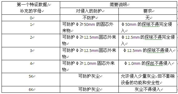 DIN 40050-9 公路車防護要求-防塵試驗標準中規(guī)定了對外來物的防護,要求同樣的防護級別(同樣的特征數(shù)據(jù))。在這種情況下,只能用第一個特征數(shù)據(jù)來表示這種防護類型。具體內(nèi)容見下表。